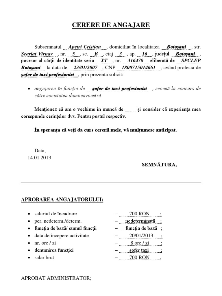 Model de cerere de angajare. Yes ne poti onora la convoaie vineri & sambata & duminica incepand cu o. Actul de identitate certificatul de nastere certificatul de casatorie diploma de studii certificatul de calificare daca declar pe propria raspundere ca declaratiile mentionate in cerere sunt corecte, in caz contrar voi suporta sanctiunile prevederilor legale ( respectiv.