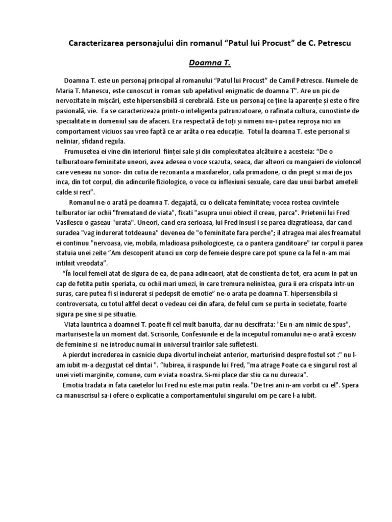 „patul lui procust, apărut in 1933, este considerat cel mai bun roman al lui camil petrescu şi una dintre cele mai originale creaţii din proza românească personajele romanului sunt relativizate prin reflectarea lor in mai multe conştiinţe. Doamna t din „patul lui procust de camil petrescu. Romanul are o structura narativa ampla, organizata pe mai multe planuri paralele sau.