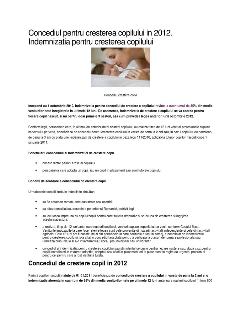 De muncă pentru creșterea copilului în vârstă de până la 2 ani(sau 3 ani, . Concediul și indemnizația de creștere a copilului se acordă părinților. Cererea către angajator, de intrare în concediul de creştere a copilului. Pentru depunerea dosarului privind indemnizația de creștere copil până la vârsta de 2/3 ani (în cazul copilului cu dizabilități) în cuantum de 85% din media . Indemnizaţia lunară pentru creşterea copilului pînă la 3 ani se stabileşte de către ctas unde a fost stabilită indemnizaţia de maternitate, iar în cazul în care .